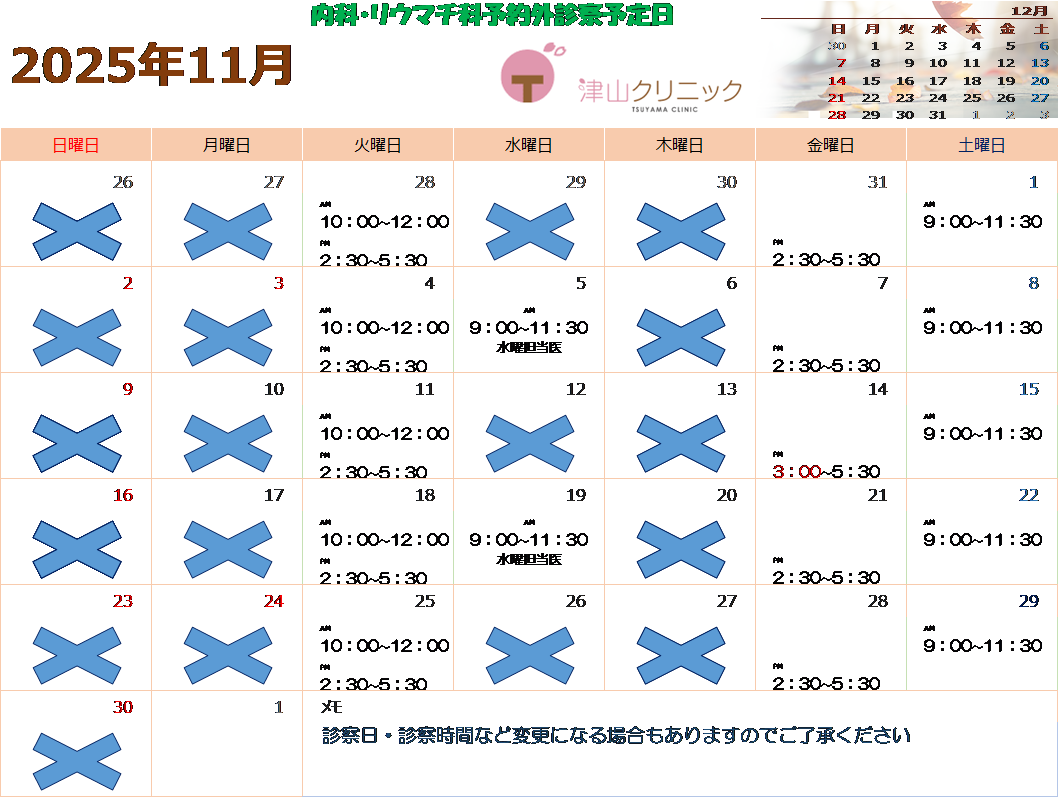 11月内科・リウマチ科予約外診療予定日